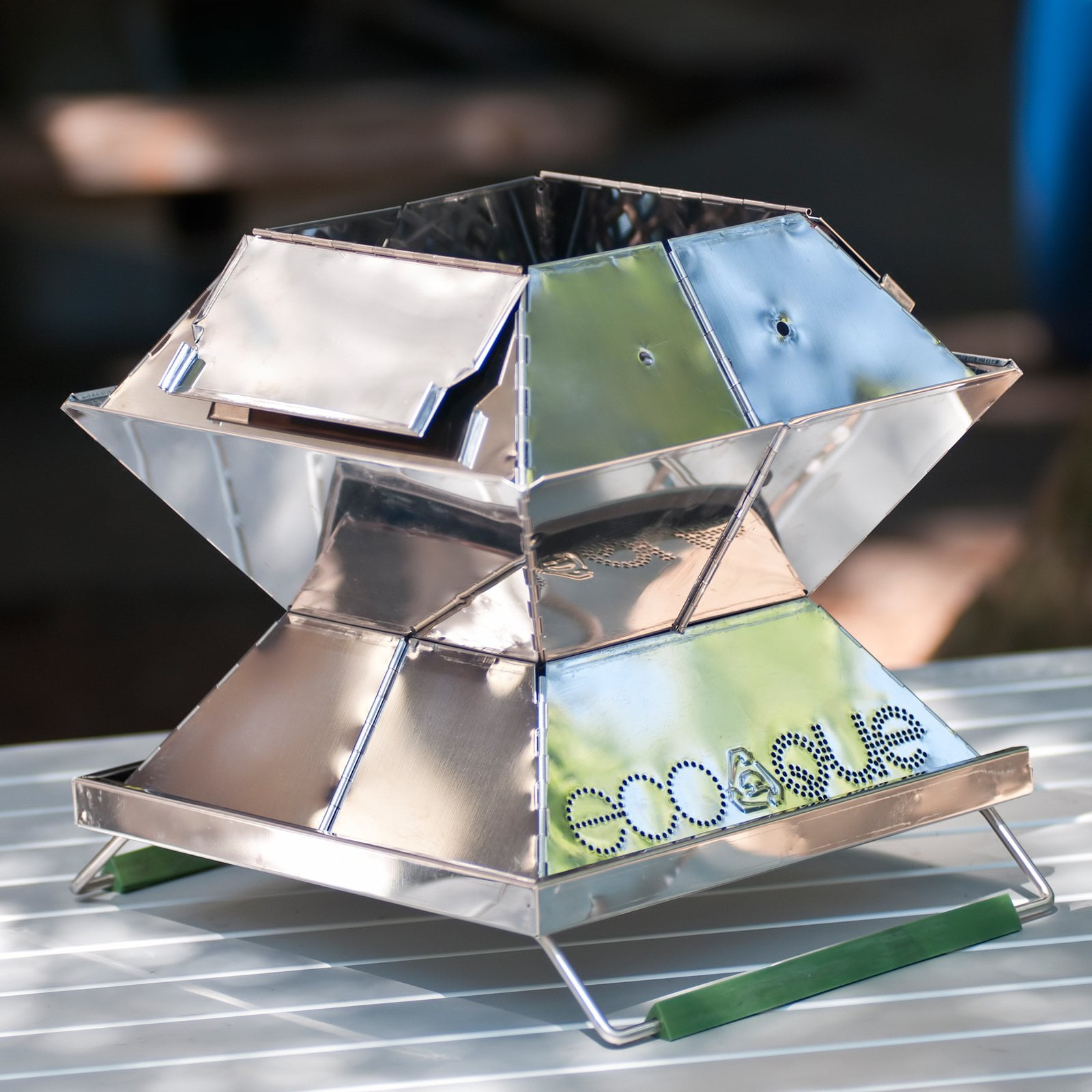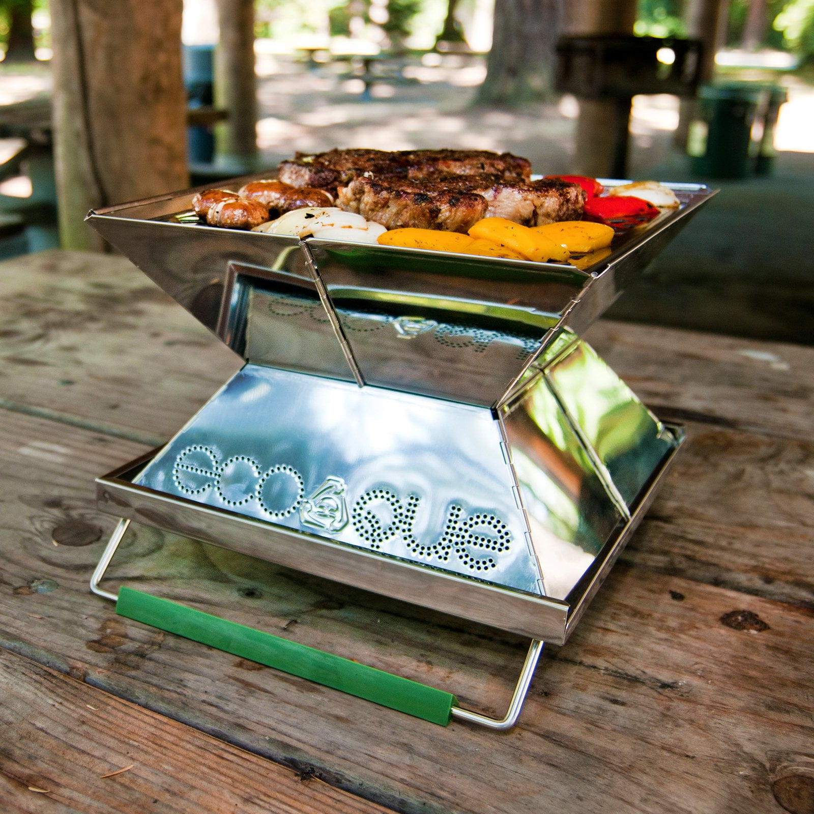 The EcoQue portable grill used to be marketed under the name Pyromid It is made of stainless steel and is highly portable.