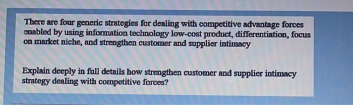 What are the four generic information system strategies for dealing with competitive forces?. Generic strategies include overall cost leadership differentiation and focus. What are the 4 generic strategies for dealing with competitive forces enabled by using IT. Editor toolbars undo Undo Keyboard shortcut CtrlZ Redo Keyboard shortcut CtrlY Basic Styles Bold Keyboard shortcut CtrlB Italic Keyboard shortcut CtrlI Paragraph.